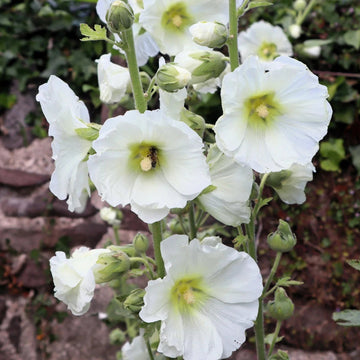Hollyhock Seeds – White Variety produce tall, elegant plants covered in large, pure white blooms...