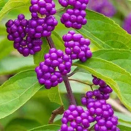 American Beautyberry is a stunning ornamental shrub known for its bright clusters of violet-purple berries that appear in late summer through early winter. Its vibrant color adds beauty to gardens while attracting birds and pollinators. This hardy, low-maintenance plant is drought-tolerant once established and ideal for creating year-round landscape interest.