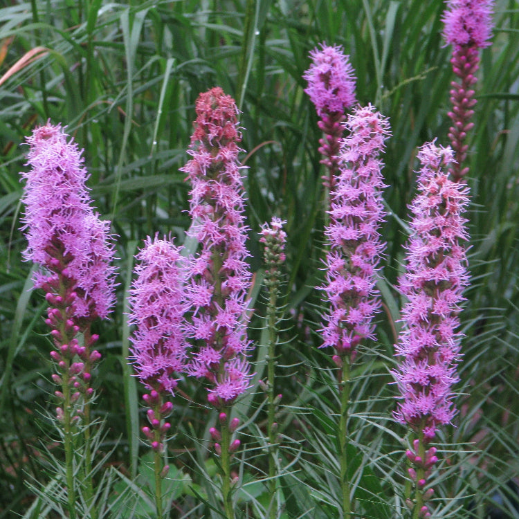 The plant features slender, grass-like foliage and dense flower spikes that bloom from the top downward, providing a unique and dramatic floral display. Blazing Star is drought-tolerant once established and thrives in well-drained soils, making it a low-maintenance yet visually captivating addition to flower beds, borders, and pollinator gardens.