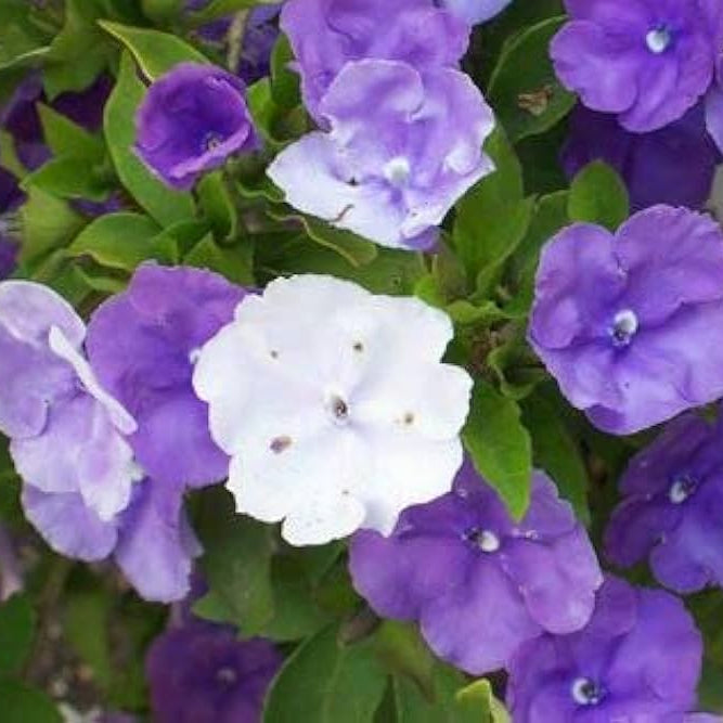 Brunfelsia, commonly known as Yesterday, Today, and Tomorrow, is a stunning perennial shrub admired for its unique blooms that change color over time—from deep violet to lavender and then to white. This evergreen plant is fragrant and perfect for adding year-round beauty to outdoor landscapes, beds, screens, and hedges. Its compact growth habit and deer-resistant nature make it ideal for gardens in warmer regions.