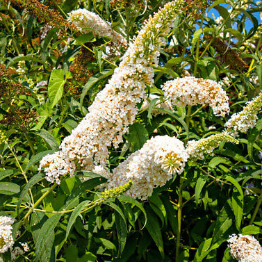 The White Butterfly Bush, scientifically known as Buddleia davidii, is a beautiful perennial shrub known for its long, fragrant flower clusters and ability to attract butterflies. This fast-growing and low-maintenance plant thrives in garden beds, borders, or patio containers, producing stunning white blooms from summer through fall. Its hardy nature makes it an ideal choice for gardeners seeking elegance and easy care.