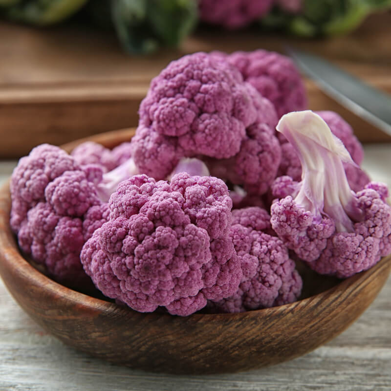 The Purple Sicily Cauliflower is a vibrant heirloom variety known for its striking deep purple heads and mild, nutty flavor. This unique type is not only visually appealing but also rich in antioxidants. It grows well in cooler seasons and is an excellent addition to any home garden.