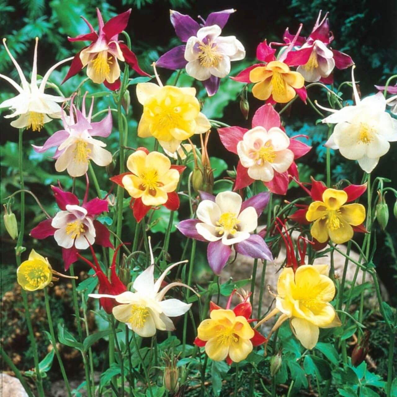 Blend of colorful Oriental Columbine varieties with elegant, spurred flowers