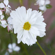 Pure white heirloom cosmos blooms with classic daisy-like petals