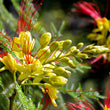 Produces clusters of bright yellow flowers with red accents.