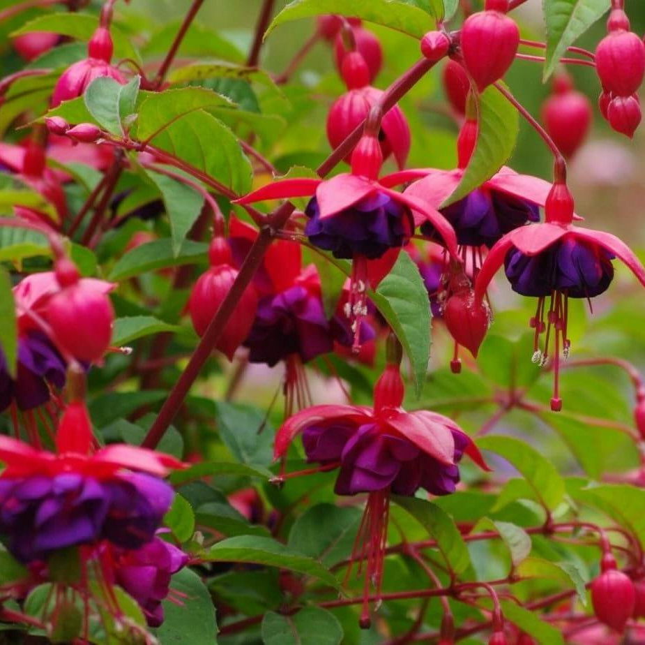 Fuchsia ‘Dark Eyes’ is a striking ornamental plant known for its vibrant two-tone blossoms in rich purple and red shades. This hanging variety produces abundant flowers throughout the growing season, adding elegance and color to patios, containers, and garden beds. Its cascading growth habit makes it a perfect choice for hanging baskets or decorative planters.