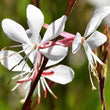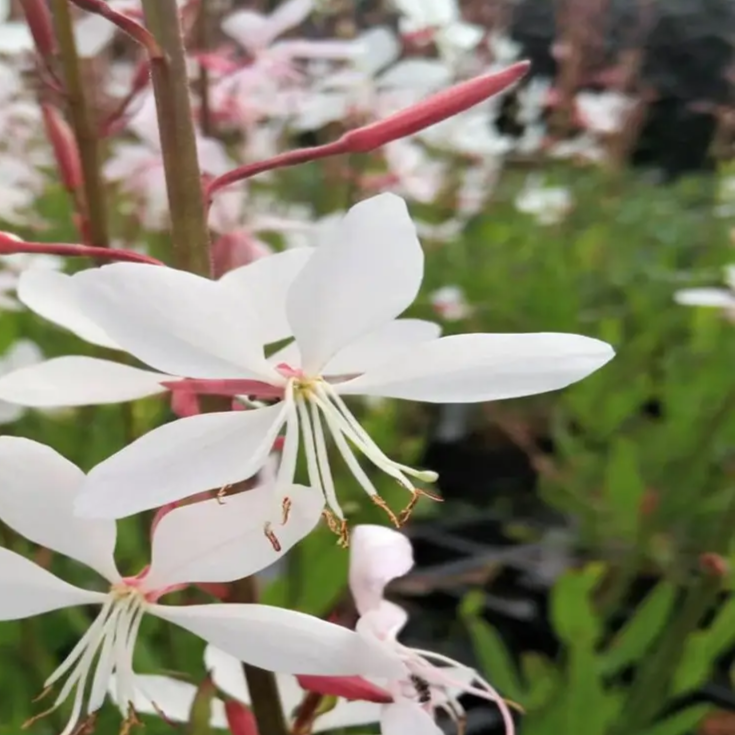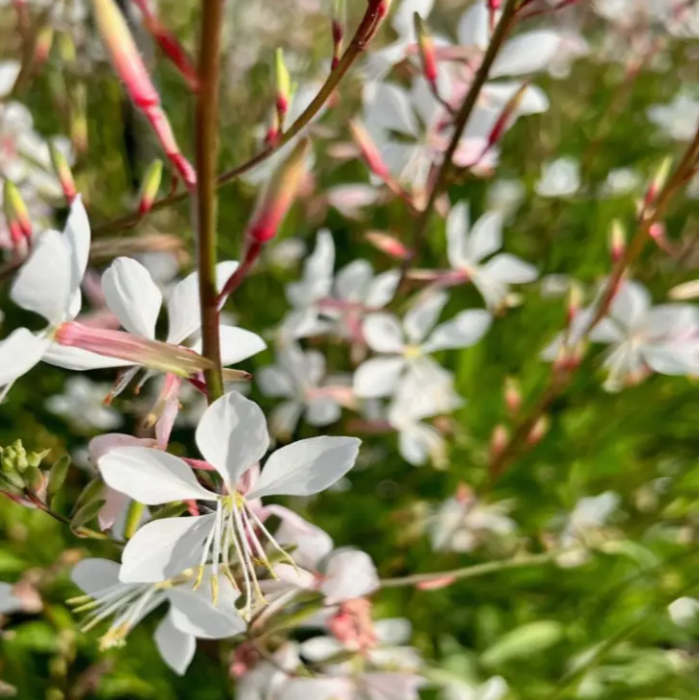 Gaura Lindheimeri, also known as “Whirling Butterflies,” is a graceful and elegant perennial that produces clouds of delicate white to pale pink blooms dancing above slender stems. This variety is admired for its long blooming period, drought tolerance, and ability to add airy texture to gardens and borders. Perfect for cottage gardens or naturalized landscapes, Gaura creates a beautiful display from late spring through fall. It thrives in sunny spots and adapts well to poor or sandy soils, making it a reliable choice for low-maintenance gardeners.