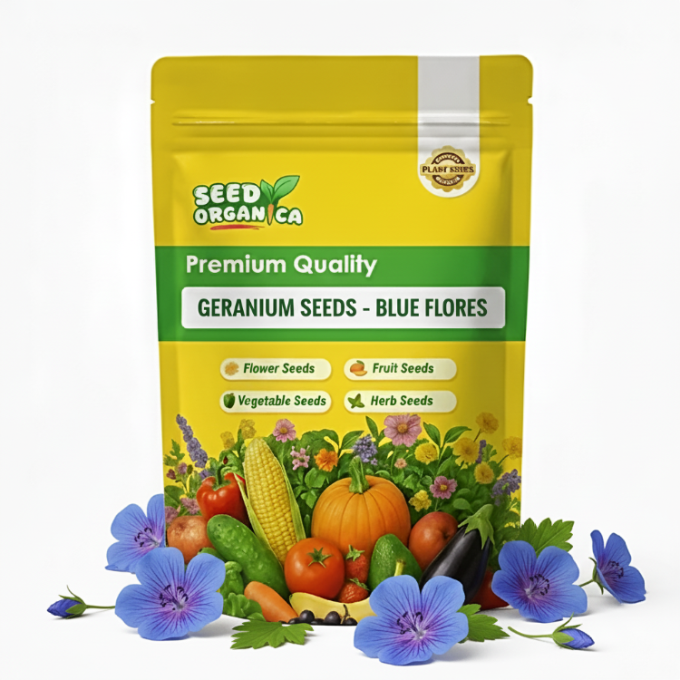 Blue Flores geranium seeds produce compact, upright plants commonly grown as warm-season annuals. Plants develop sturdy stems, rounded foliage, and a neat, mounded growth habit that makes them suitable for garden beds, borders, containers, and patio planting. This variety performs best in mild to warm climates with consistent sunlight and good air circulation. Blue Flores geraniums adapt well to a range of growing conditions when planted in well-drained soil and provided regular, moderate watering, making them suitable for home and small-scale ornamental planting.