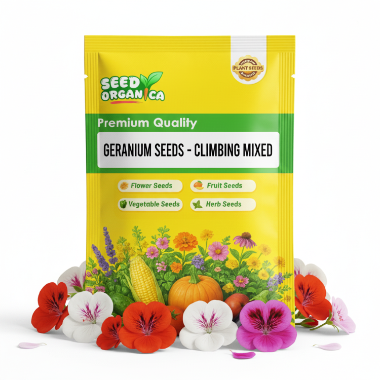 Climbing Mixed geranium seeds grow into vigorous plants with trailing to climbing stems that can be trained on supports or allowed to cascade naturally. This geranium type is well suited to mild and warm climates and is commonly grown in containers, hanging baskets, trellises, and garden borders. Plants adapt well to different garden settings when provided with well drained soil, regular moisture, and adequate sunlight. Seeds are typically started indoors and transplanted outdoors once temperatures are stable.