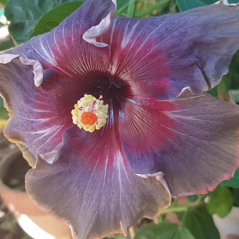 Produces large, colorful hibiscus flowers in shades of black, pink, and purple.