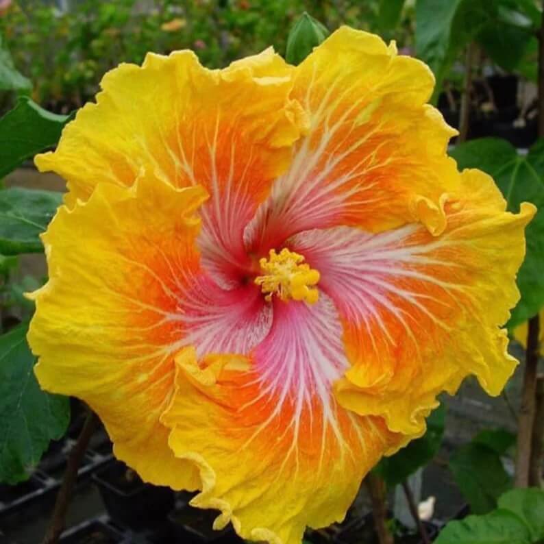 Produces vivid yellow and orange hibiscus blooms