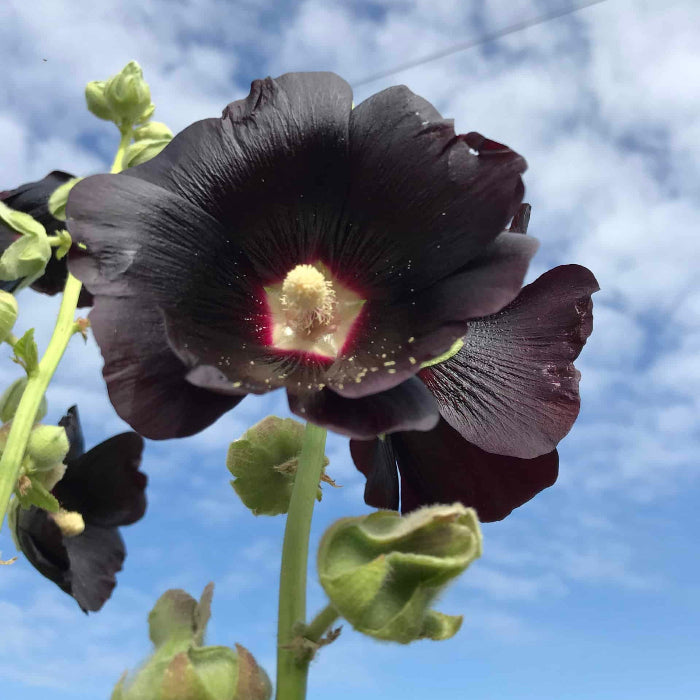 Hollyhock ‘Blacknight’ is a striking variety known for its tall spikes of deep, near-black blooms that add bold drama to any garden. These classic cottage garden favorites produce rich, velvety flowers that create a stunning contrast against green foliage. Ideal for planting along fences, walls, or as a backdrop in flower beds, Blacknight Hollyhocks bring timeless beauty and elegance to outdoor landscapes. This biennial plant blooms in its second year and is a reliable self-seeder, returning year after year with minimal effort.