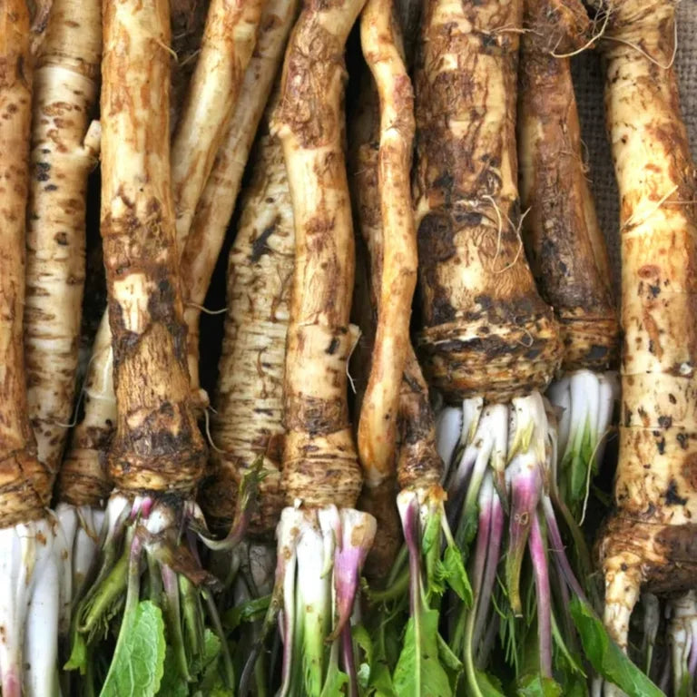Horseradish is a hardy perennial root plant known for its sharp, tangy flavor and vigorous growth. This heirloom variety produces thick, white roots with a strong aroma, ideal for use in condiments, sauces, and seasonings. Easy to cultivate and resilient to various soil conditions, Horseradish adds a classic, bold taste to culinary dishes.