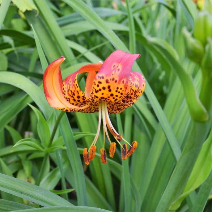 Produces vibrant orange flowers with distinctive red spots