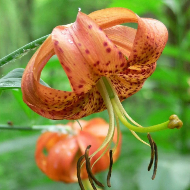 The Orange Turk’s Cap Lily (Lilium superbum) is a magnificent perennial known for its gracefully recurved petals and vibrant orange blooms speckled with deep maroon spots. This variety stands tall in the garden and is ideal for creating a bold statement in borders or naturalized areas. The flowers resemble small caps, hanging elegantly on tall stems, attracting butterflies and hummingbirds throughout the summer. These hardy lilies are low-maintenance and perform best in full sun to partial shade with well-drained soil.