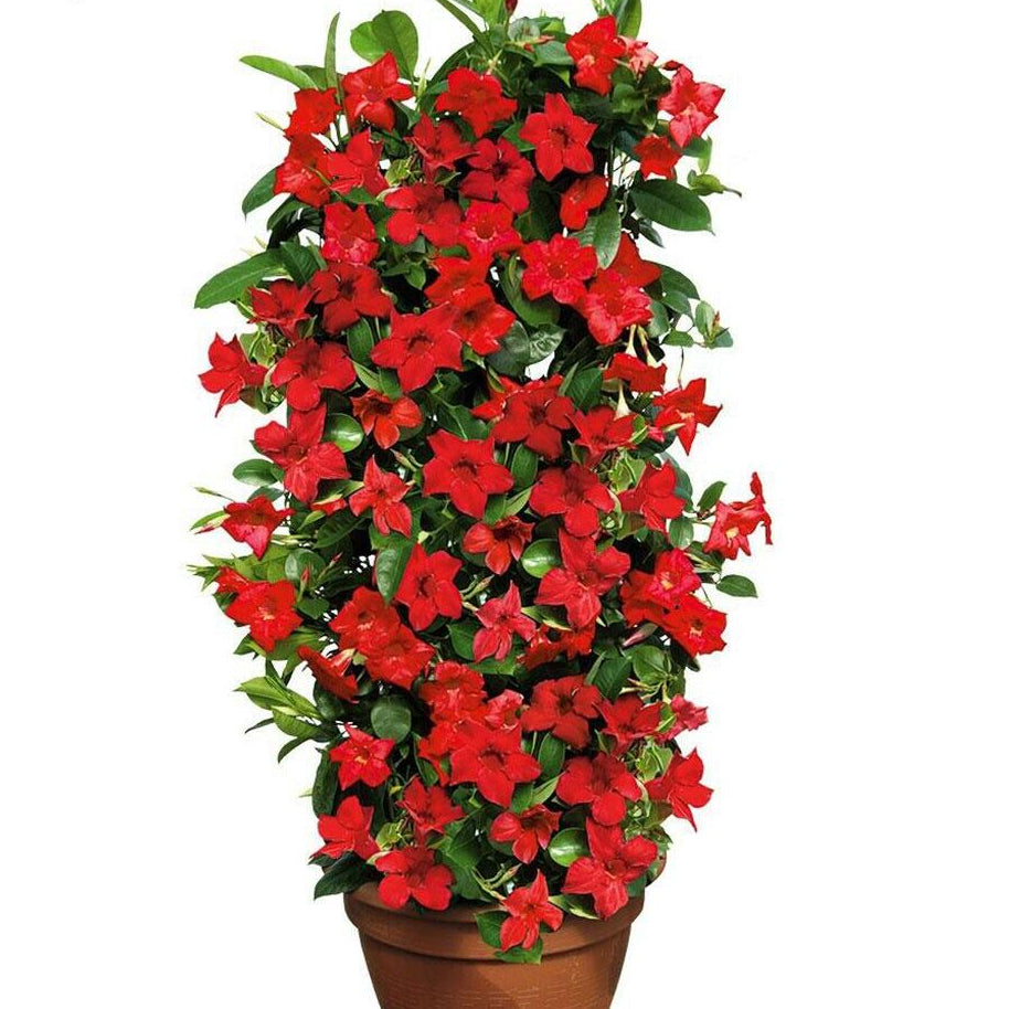 Mandevilla sanderi, also known as Brazilian Jasmine, is a tropical climbing plant admired for its glossy green foliage and elegant trumpet-shaped blooms. This vigorous vine adds a touch of sophistication to patios, trellises, and balconies. The flowers bloom profusely during warm months, displaying vibrant pink tones that enhance any outdoor space. Mandevilla is an excellent choice for gardeners seeking lush growth, long-lasting blooms, and a tropical appearance with minimal maintenance.