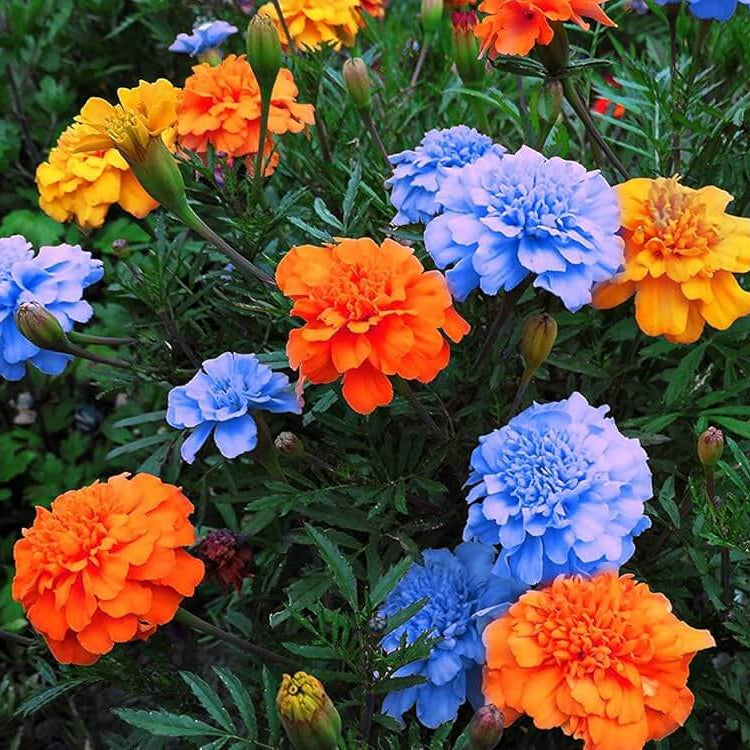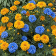 Vibrant blue and yellow mixed marigold blooms