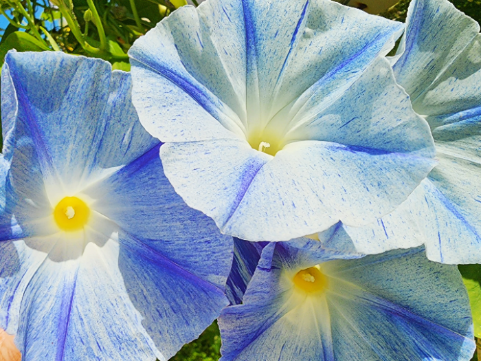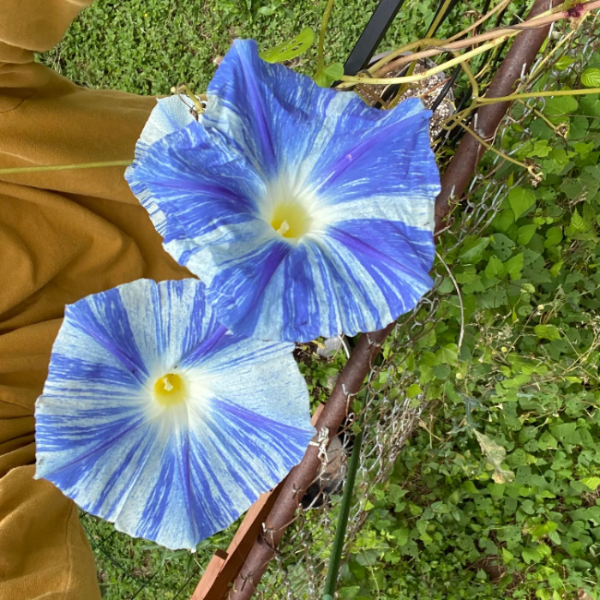 Produces large, 5–6 inch trumpet-shaped blue and white streaked flowers.