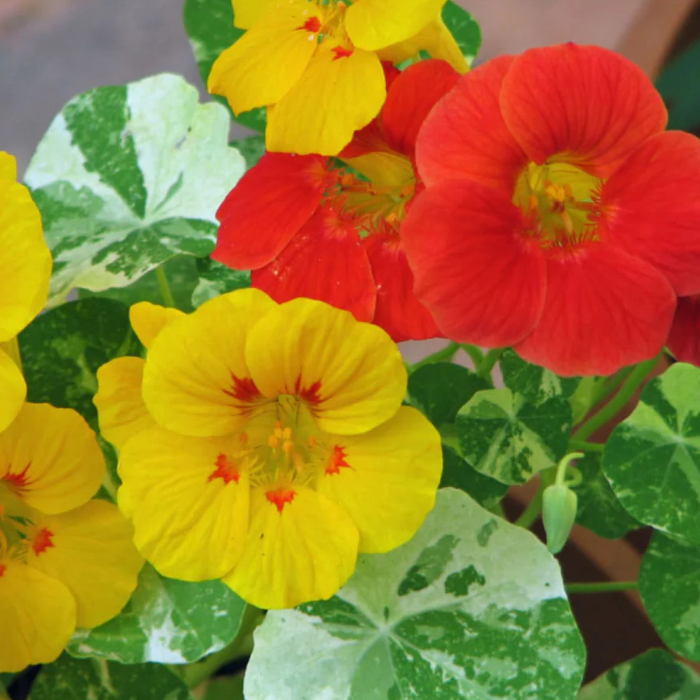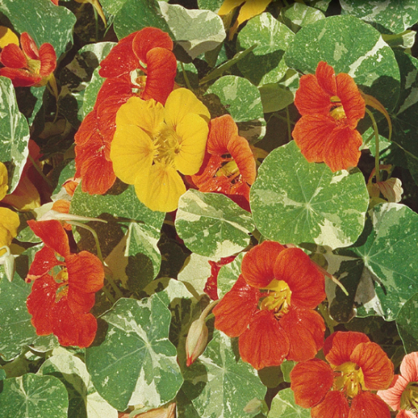 Nasturtium ‘Mixed Colors’ is a vibrant blend of easy-to-grow flowering plants that add cheerful color and charm to any garden. Known for their striking shades of orange, yellow, red, and cream, these hardy annuals are loved by home gardeners for their fast growth and versatility. Nasturtiums thrive in poor soils and sunny conditions, making them perfect for garden borders, hanging baskets, containers, and ground cover. Their round leaves and bright blooms also attract butterflies and other pollinators throughout the season.