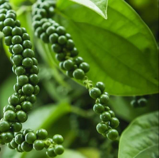 Green Piper nigrum plants are tropical, perennial climbing vines with a woody growth habit that develop long trailing stems when provided with support. They are best suited to warm, humid climates and are typically grown in frost-free regions or controlled environments. Plants grown from seed establish gradually and benefit from consistent warmth, filtered sunlight, and well-drained soil with regular moisture. This species is commonly cultivated on trellises, poles, or supports in gardens, greenhouses, or large containers where climbing growth can be managed.