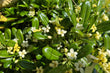 Evergreen shrub with glossy, leathery leaves and white, fragrant flowers.