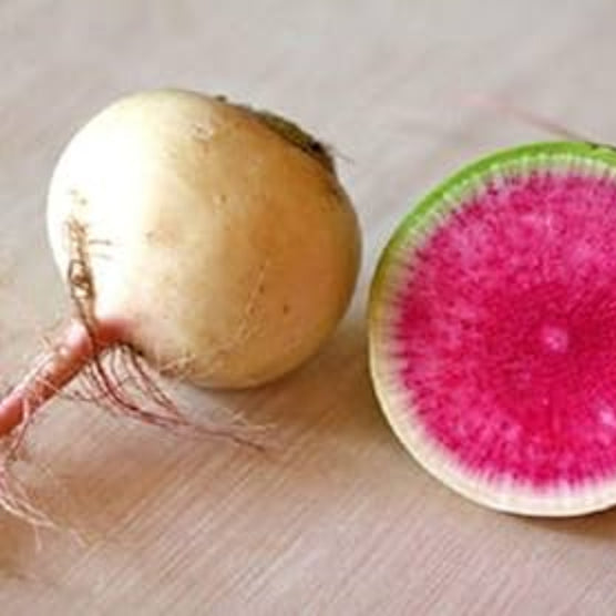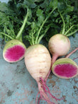 Crisp Red Watermelon Radish Seeds produce stunning, round radishes with pale green to creamy white skin and a vibrant deep-red interior. Known for their crisp texture and mild sweetness with a hint of pepper, this variety is perfect for adding color and flavor to fresh dishes. These radishes thrive in cool seasons and perform well in home gardens, raised beds, and vegetable patches.