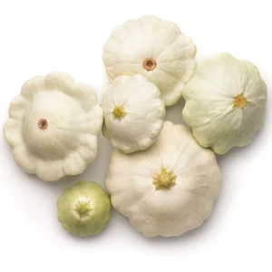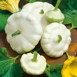 The White Patisson Squash, also known as Scallop Squash, is a unique heirloom variety prized for its round, scalloped edges and tender white flesh. This early-producing plant yields attractive, creamy-white fruits that are perfect for grilling, roasting, and sautéing. Its compact growth makes it ideal for both home gardens and container planting.