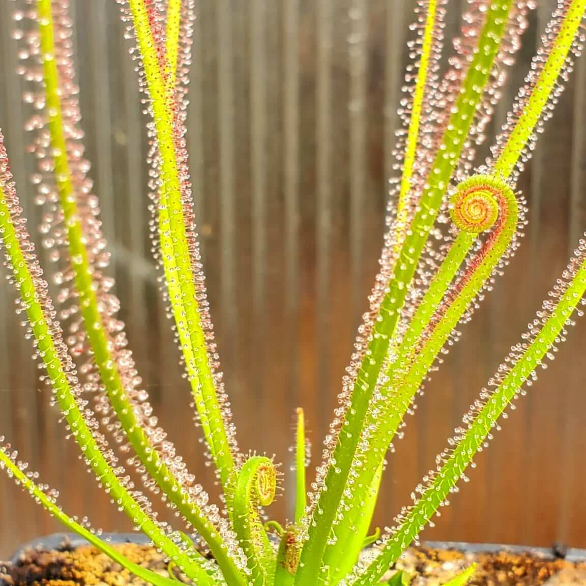 Carnivorous Plant: Naturally traps small insects using sticky, dew-covered filaments.